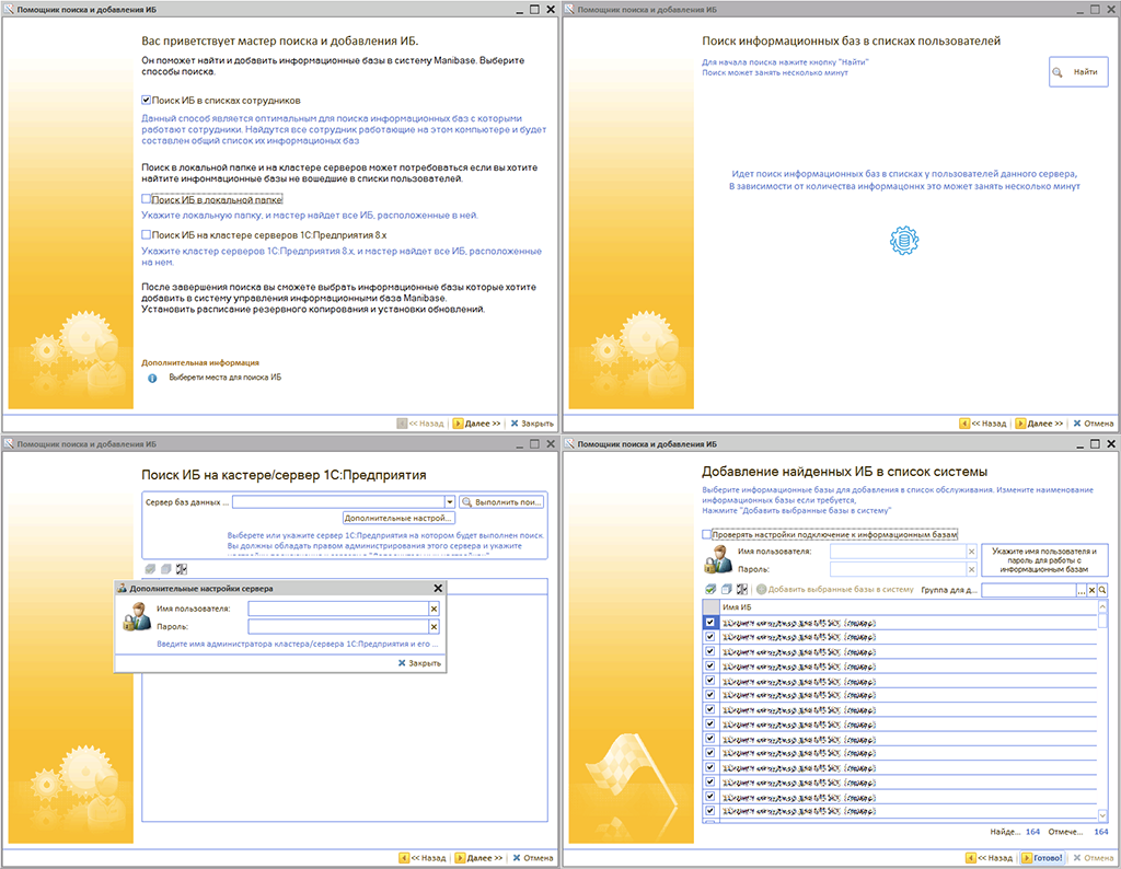 Через 5 минут после установки система готова к работе. Система найдет ВСЕ ваши информационные базы